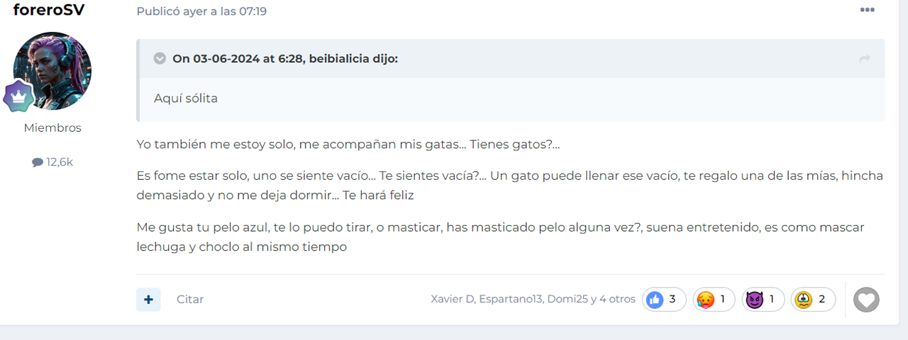 foreroSV Publicó 4 Jun 2024 Publicó 4 Jun 2024 3 minutos atrás, Dargorath dijo: sólo me retiraré lentamente , jajajajaja(igual se que es webeo el post, pero iugh) oye no es weveo... me gusta masticarle la cabeza a las minas que me gustan y morderles el pelo... aunque en el lado B sólo una tuvo el privilegio XDDDDD Que mi gata me hincha es verdad también, weona insoportable XD Citar