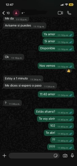 Hola amor cómo estás? Adjunto pruebas como fue la cosa, porque acá estás tratando de dejarme mal cuando no es así. Te escribí y te esperé y no fuiste capaz de responder. Porque no fue a los 10 15 minutos como lo estás diciendo acá. Cuídate amor